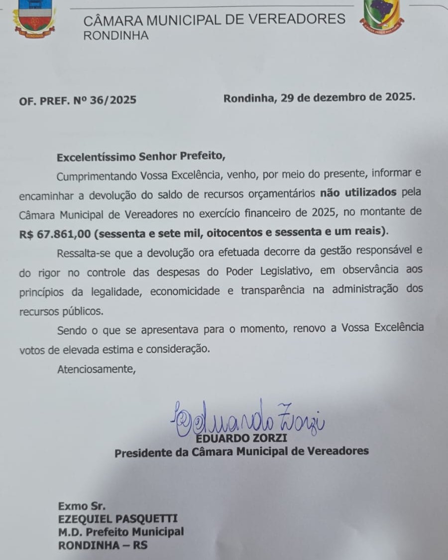A Câmara Municipal de Vereadores de Rondinha realizou a devolução de R$ 67.861,00 em sobras orçamentárias ao Poder Executivo Municipal, valor resultante da economia e do controle de gastos ao longo do exercício financeiro do ano de 2025.
